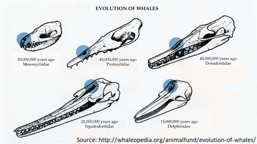Even more remarkably, it created and arranged them with the similarites all moving in the same direction. That is, if you look up and down the tree of forms that are most like surviving whales, for example, the movement of the nostrils from the end of the nose up to the forehead, the change from forefeet to flippers, the reduction of the hind legs and the development of a tail fluke all move in the same direction, beginning with a hoofed land animal and gradually becoming more whale-like. If you line them up by nostril position, you’ve also lined up all the other features in a smooth progression: you don’t find the nostrils forming a smooth sequence while hind legs and tail flukes appear and disappear, grow and shrink at random.